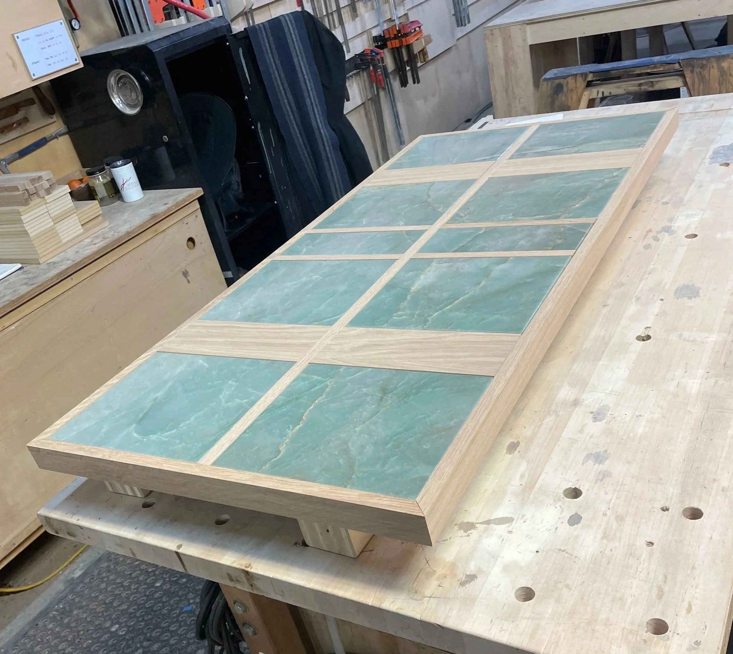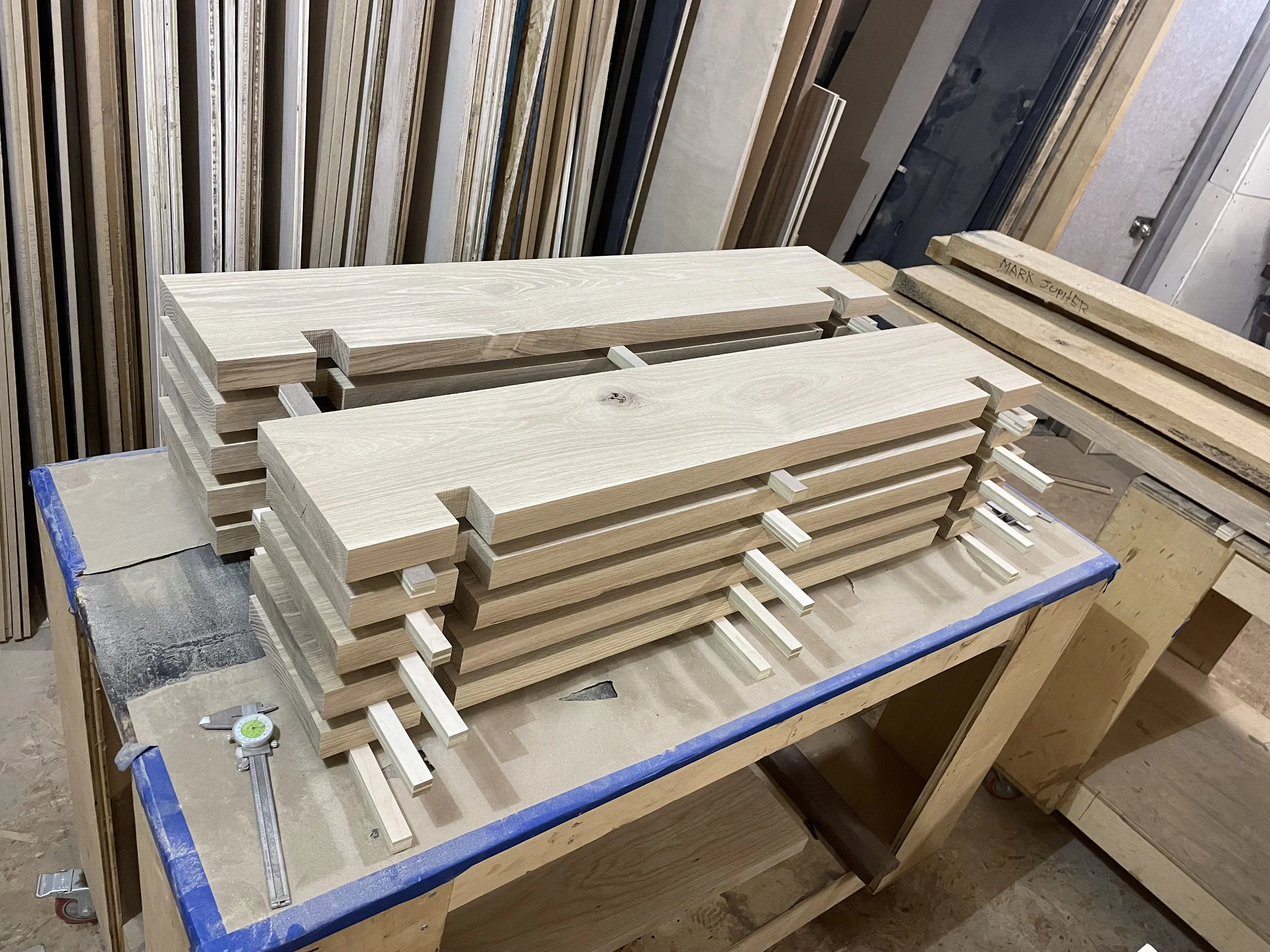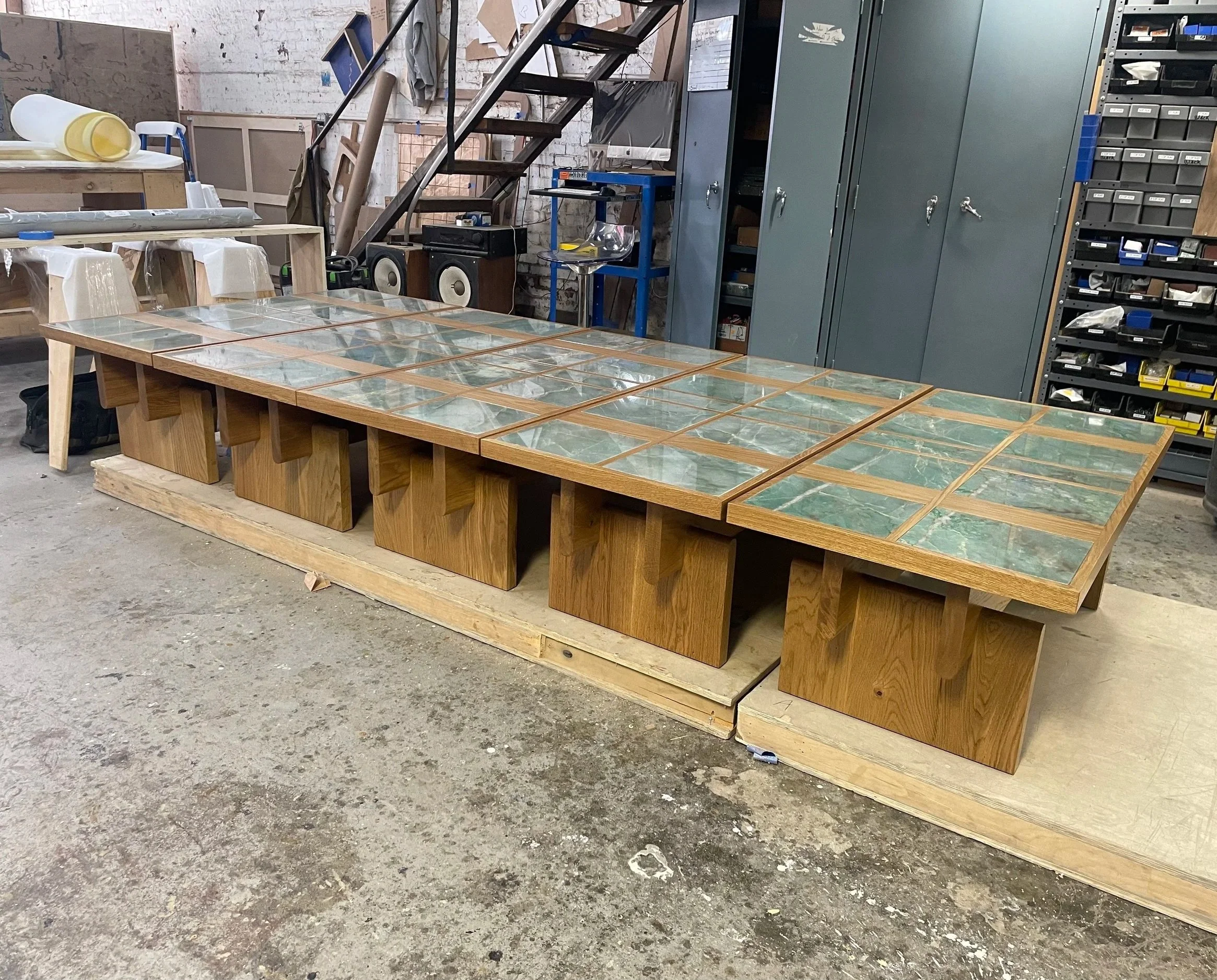 Bases made from solid white oak. Tops made from white oak, plywood, mdf, and veneer. Each frame was made custom to tightly fit stone tolerances.