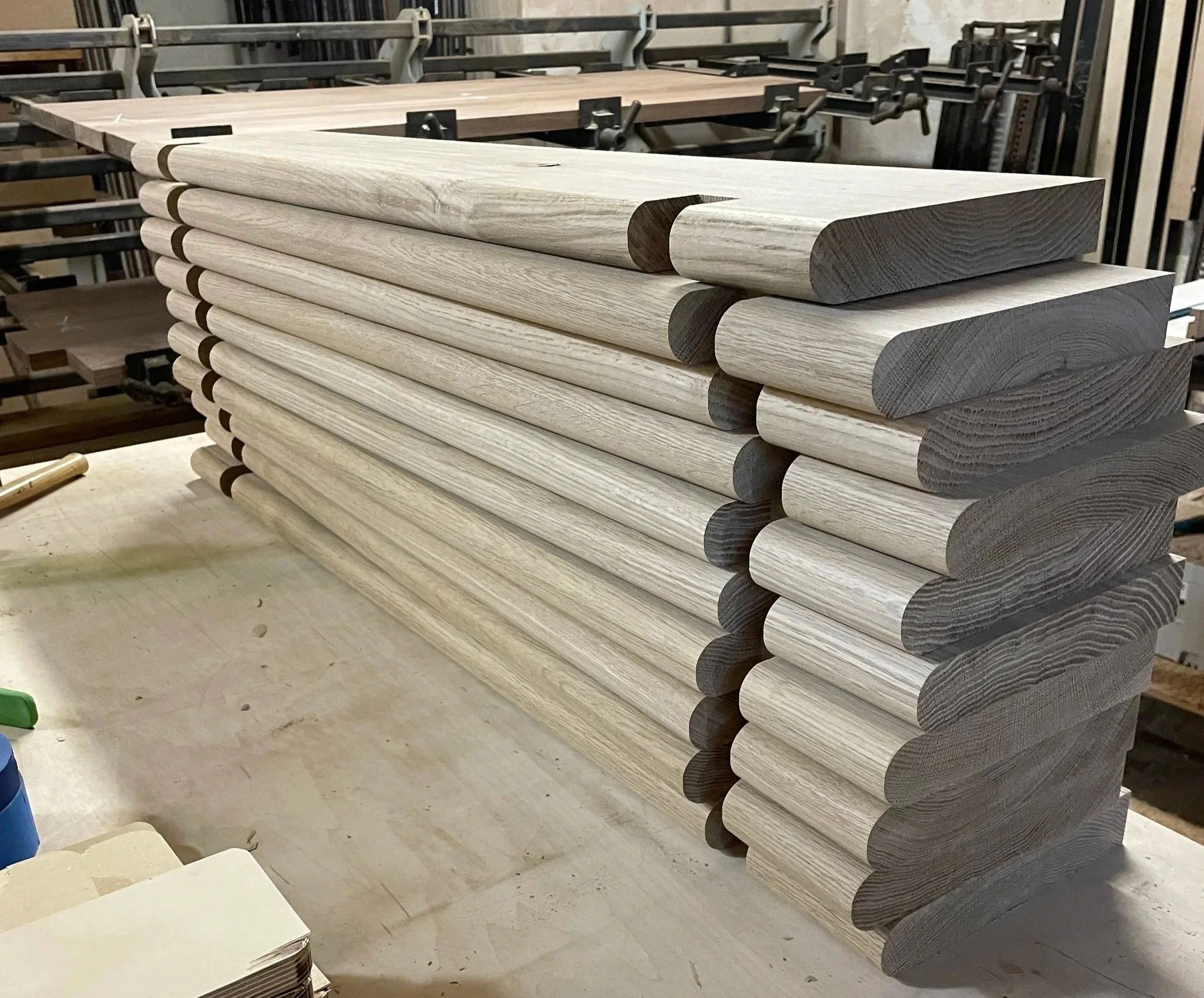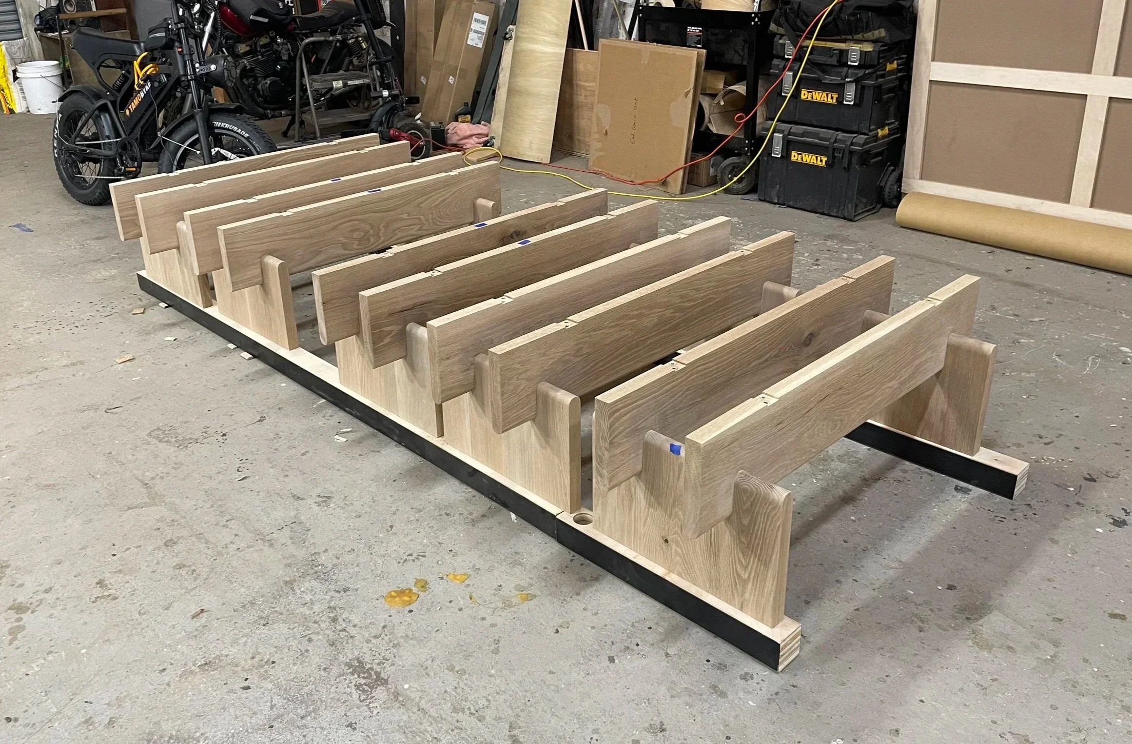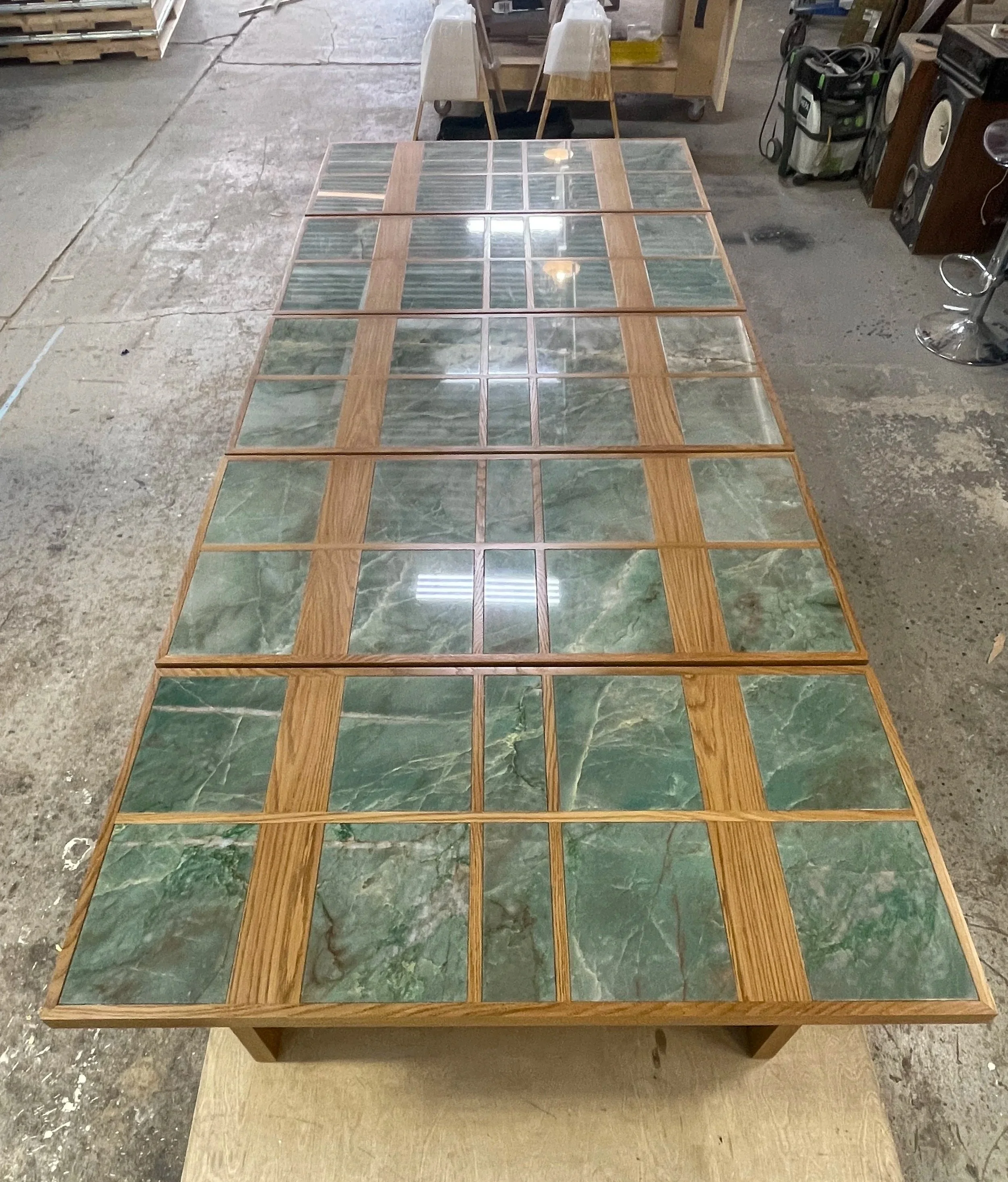 Bases made from solid white oak. Tops made from white oak, plywood, mdf, and veneer. Each frame was made custom to tightly fit stone tolerances.