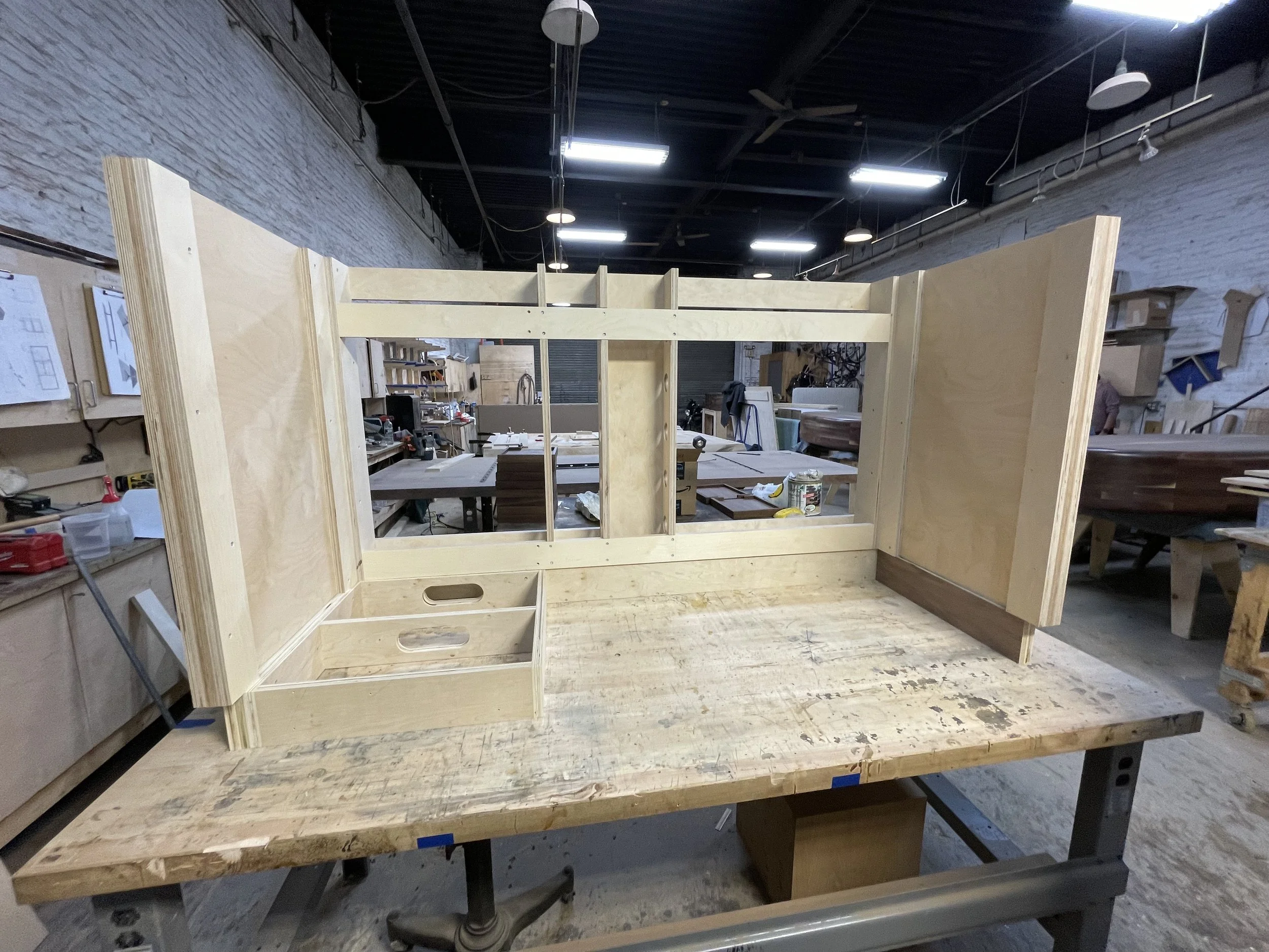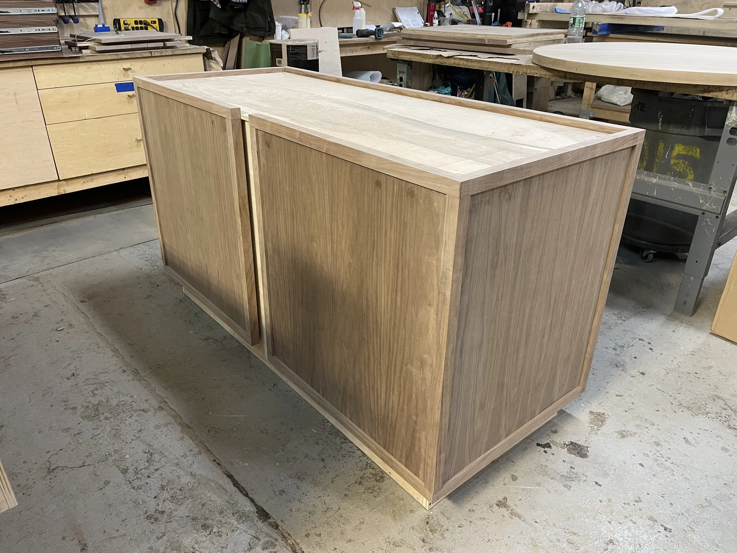 Internal structure made from plywood. Visible cabinetry made from solid walnut, and veneered plywood and mdf.