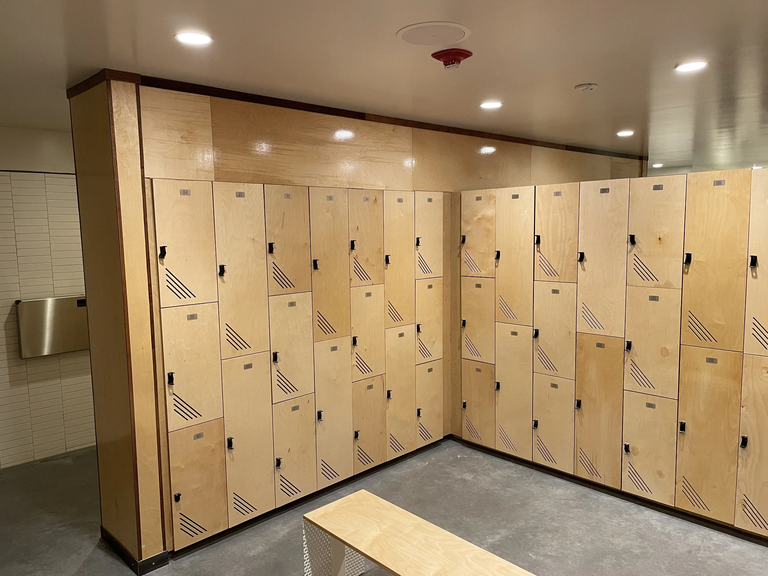 Once all of the lockers were anchored in place, birch plywood paneling was installed to the ceilings. Walnut trim was added around the ceiling and around corners. Powder-coated perforated steel benches with birch plywood seats were brought in as the final pieces of the rooms.