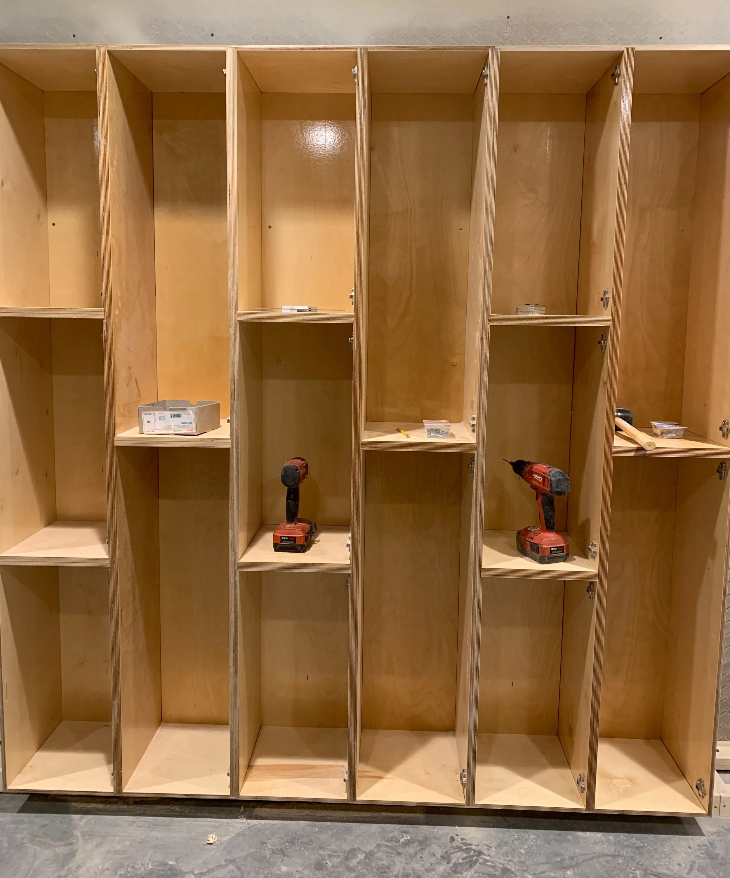 First steps of the project included making toe kicks and installing them level to create a solid foundation for the wood locker units to rest on. Strips of wood furring were also set flush with the existing sheetrock to anchor locker units to the wall.